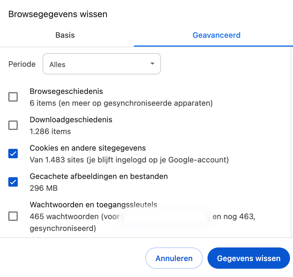 - Selecteer de periode waarvoor je de gegevens wilt wissen en vink ‘Gecachte afbeeldingen en bestanden’ aan.